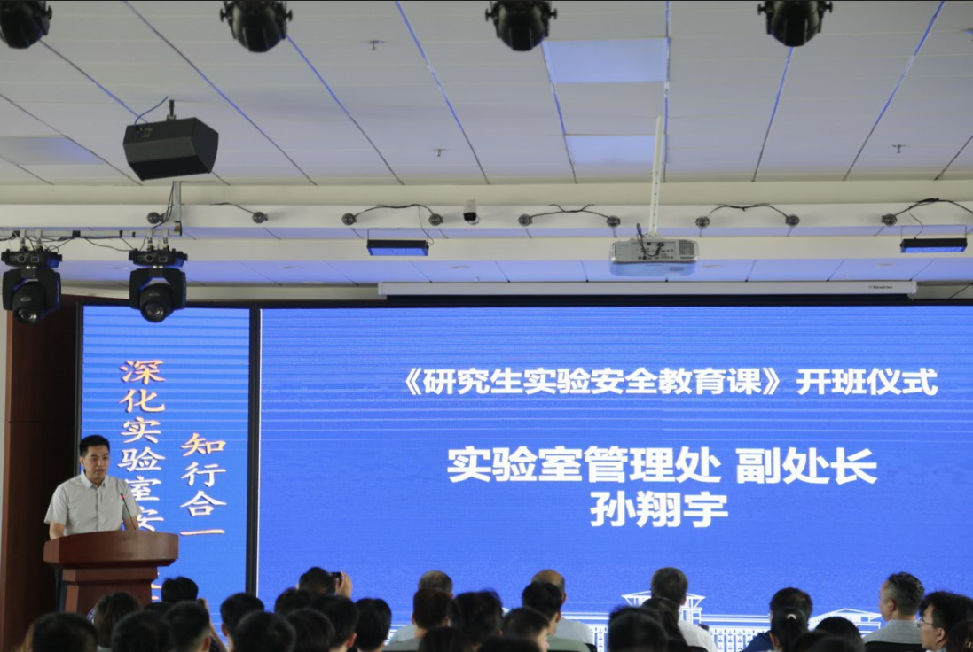 会议第二项,由实验室管理处副处长孙翔宇老师讲话。孙翔宇老师指出实验室安全是一切科研活动可持续的基石。实验室安全教育是研究生进入实验室开展学习和科研活动的重要安全保障。