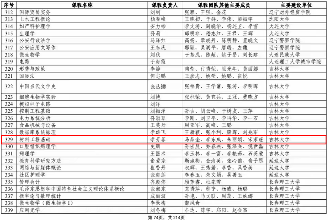 2023年4月11日,根据《教育部关于一流本科课程建设的实施意见》(教高〔2019〕8号)和《教育部办公厅关于开展第二批国家级一流本科课程认定工作的通知》(教高厅函〔2021〕13号)的有关要求,经各省级教育行政部门和高校申报推荐,网络评审和会议评审,拟认定5751门课程为第二批国家级一流本科课程,其中,线上课程1095门,虚拟仿真实验教学课程472门,线上线下混合式课程1801门,线下课程2076门,社会实践课程307门。其中我院李芳菲、马品奎、李东成、朱丽娟、宋家旺等教师主讲的《材料工程基础》课程荣获国家级一流本科课程(线上线下混合式)。