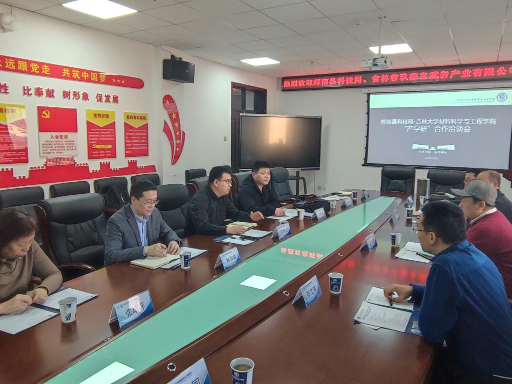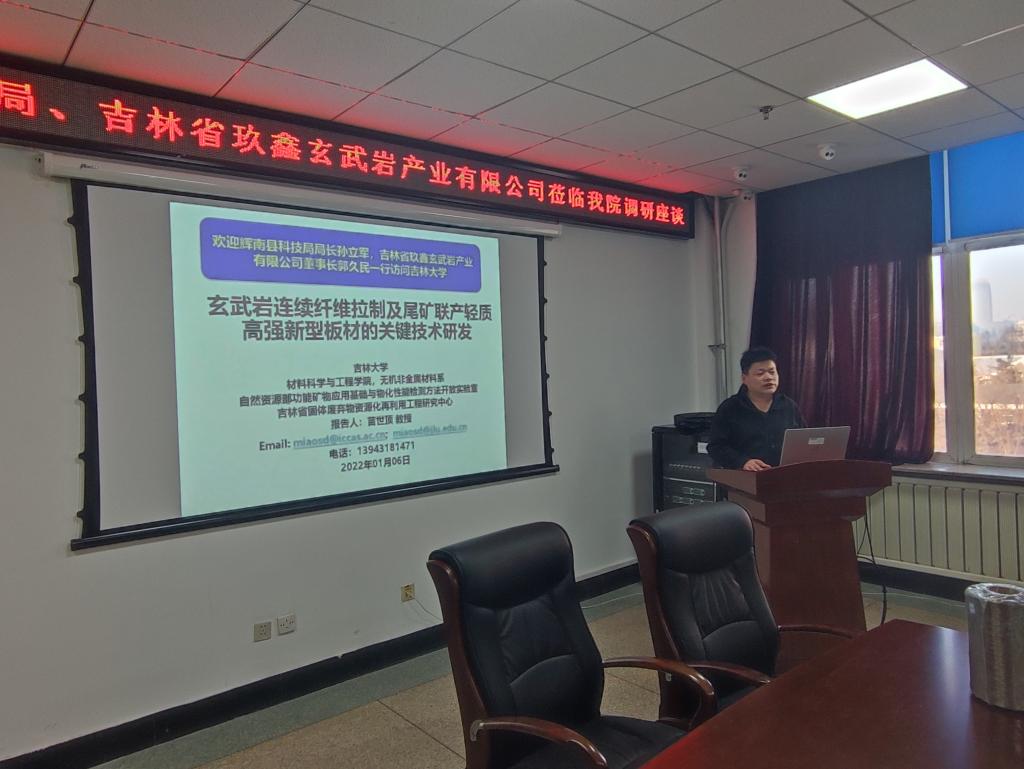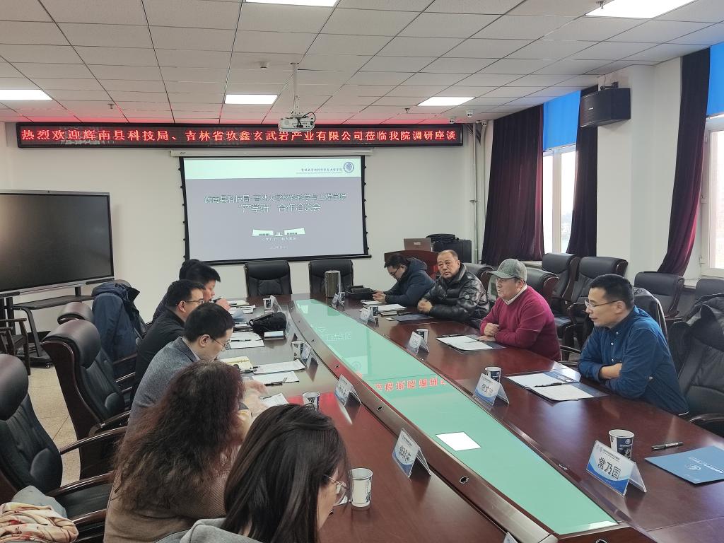 南岭校区机械材料馆410会议室举行。辉南县科技局局长孙立军、副局长张文波、吉林省玖鑫玄武岩产业有限公司董事长郭久民,色图
