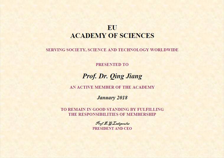 蒋青教授入选2018年欧盟科学院院士(Member of the EU Academy of Sciences, EUAS)(证书见图1)。新一届院士由10名诺贝尔奖得主和科学院院长组成的2018年度理事会(见表1)选举产生。此次入选,是欧盟科学界对蒋青教授学术造诣和科学贡献的充分肯定。