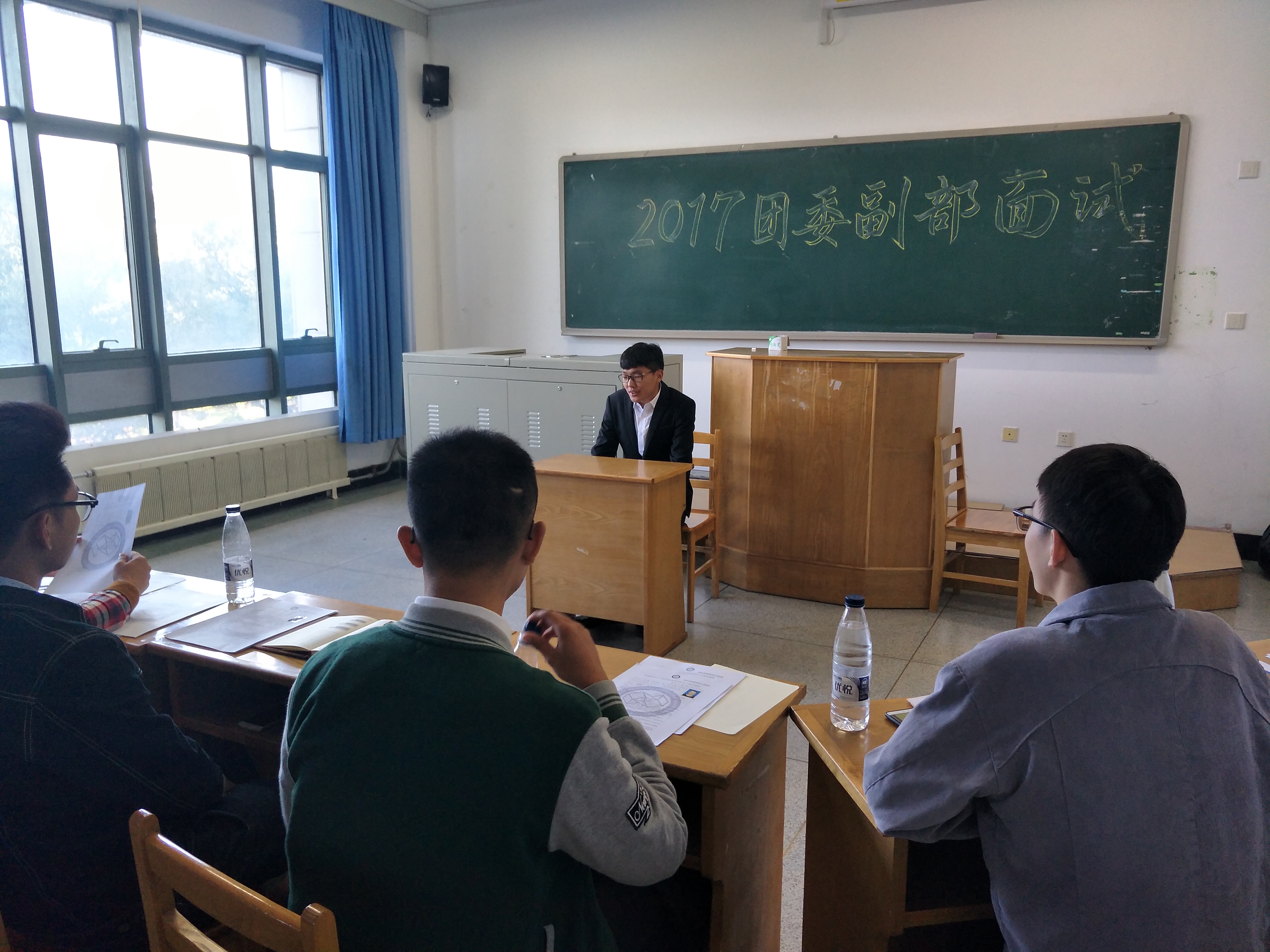 于2017年9月17日在逸夫教育大楼三楼举行了学生干部换届面试。团委书记兼2016级辅导员严冬老师、2015级辅导员佟昊天老师出席了本次换届活动。色图