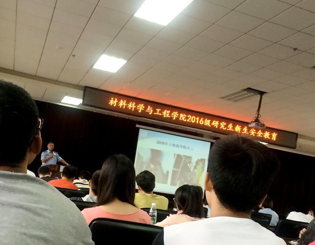 材料学院的学科建设、科研水平及师资队伍,同时对材料学院的人才培养、就业形势和文体活动等进行详细说明;东区保卫办公室消防科的韩旭老师为2016级研究生新生进行了消防安全知识教育,增进了大家的消防意识和应对突发火情的处置能力;东区综合办治安科的于珺科长对2016级研究生新生进行了综合治安专题讲座,以防盗为主线教育广大新生提高自身防盗意识;于雅琳老师作了学位与研究生教育相关政策的专题讲座,让2016级研究生深入了解到了学校有关研究生教育的相关政策和规章制度,提高了新生的制度观念。详细讲解了新生入学注意事项并结合校园典型案例,对于广大新生即将面临的各种问题深入浅出的进行解析,传授有效防范措施,确保大家度过一个安全稳定的学习和科研生活。