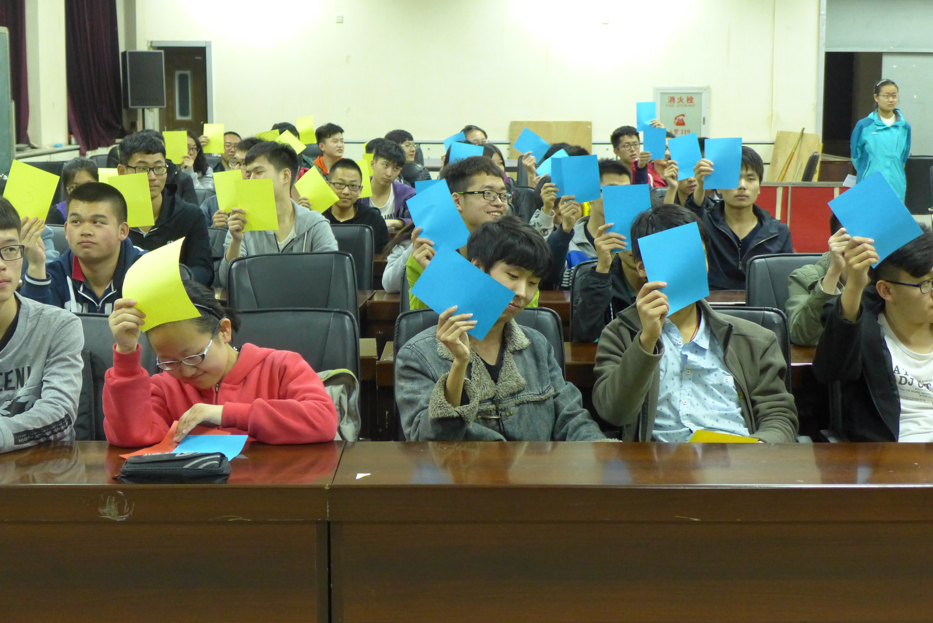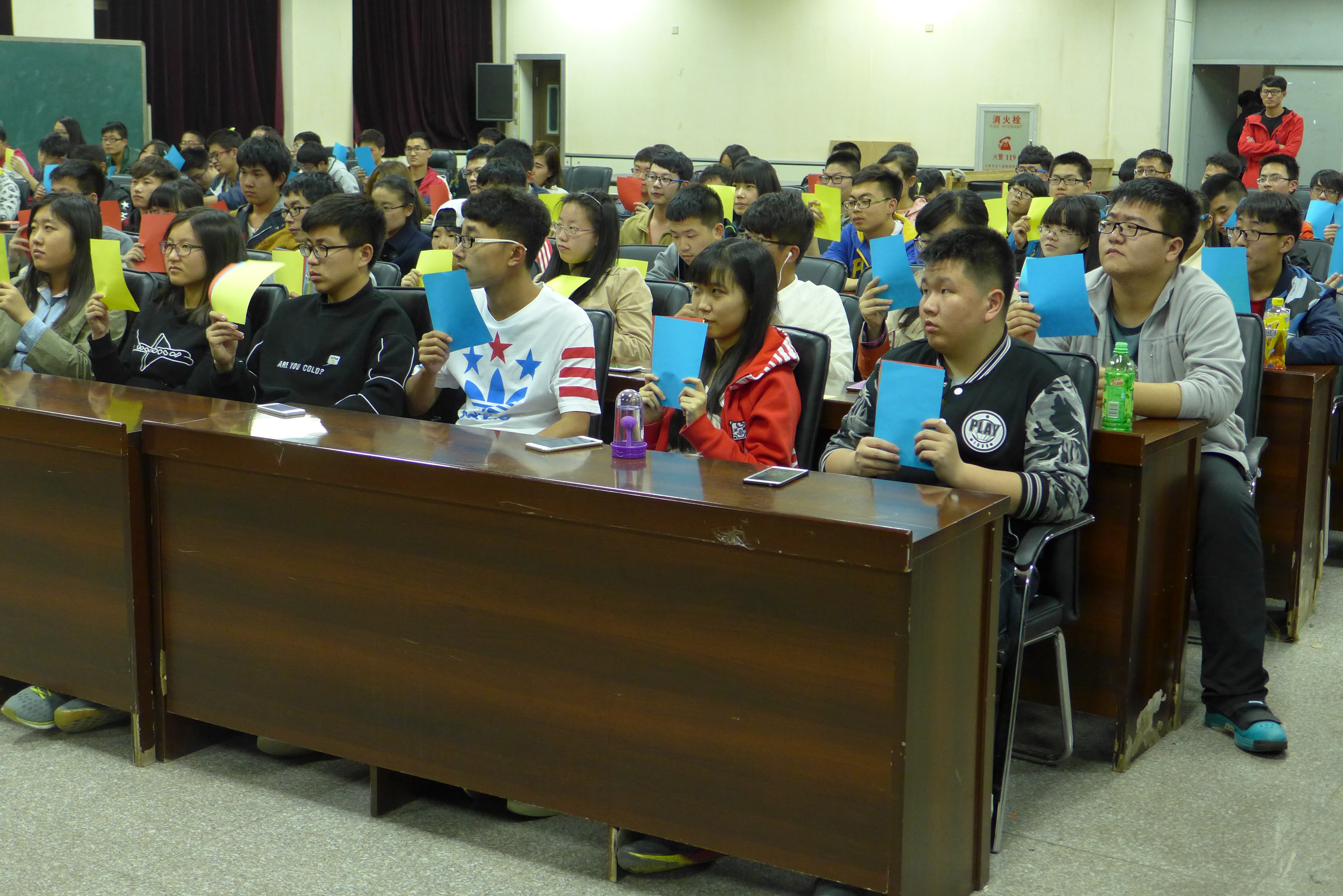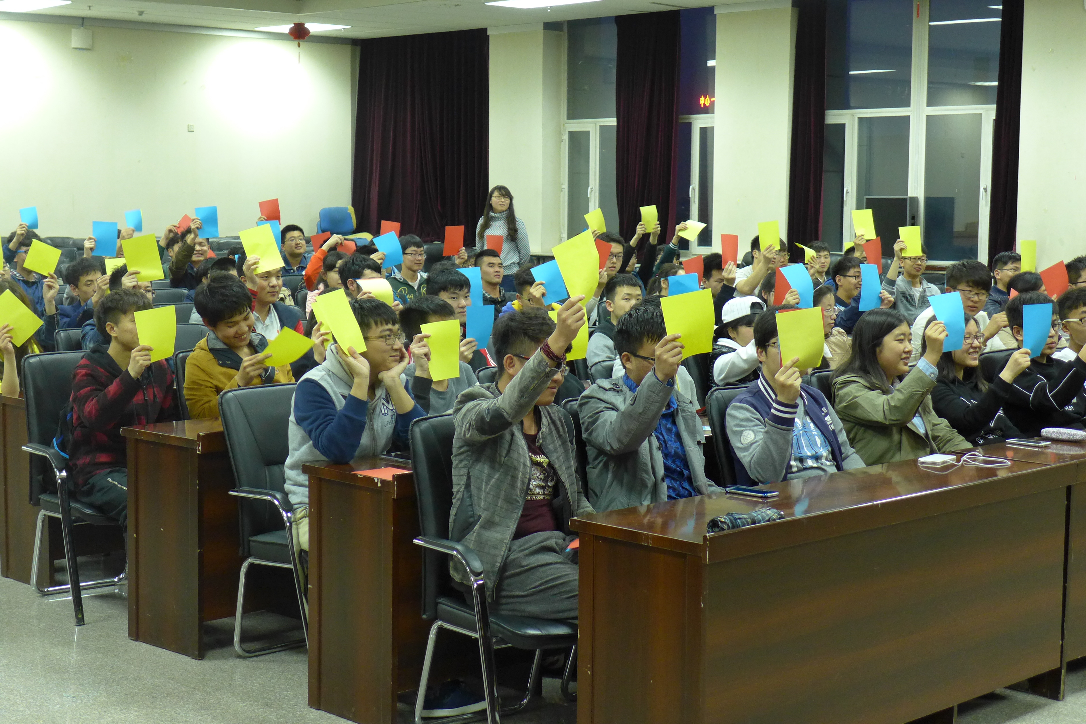 训练一开始,同学们先按原有队形就坐,并复习了上次训练中学习的口号——“材料群雄,气贯长虹,鲲鹏展翅,笑傲苍穹”。这大气铿锵的口号展现出了材料学院学生勇于挑战困难的精神和积极进取的决心。复习过后,同学们用彩纸代替纸扇进行了新的表演内容的训练。学长学姐们将同学们划分成几个小组,各个小组的同学跟着学长的口令以不同顺序举起红、黄、蓝三种颜色的彩纸,再辅以口号相配合,组成了一场完整的表演。一开始,由于部分同学态度散漫没有充分重视训练内容导致整体动作散乱,远远达不到整齐利落的标准,但经过学长学姐们一再强调,观众队伍作为运动会上学院精神面貌象征肩负着的重要责任,渐渐调动起了同学们的积极性与集体荣誉感。接下来,在一次又一次的重复训练中,同学们的动作越来越整齐划一,口号越来越准确娴熟,相信运动会上的表演会因同学们的努力付出而更加精彩纷呈。