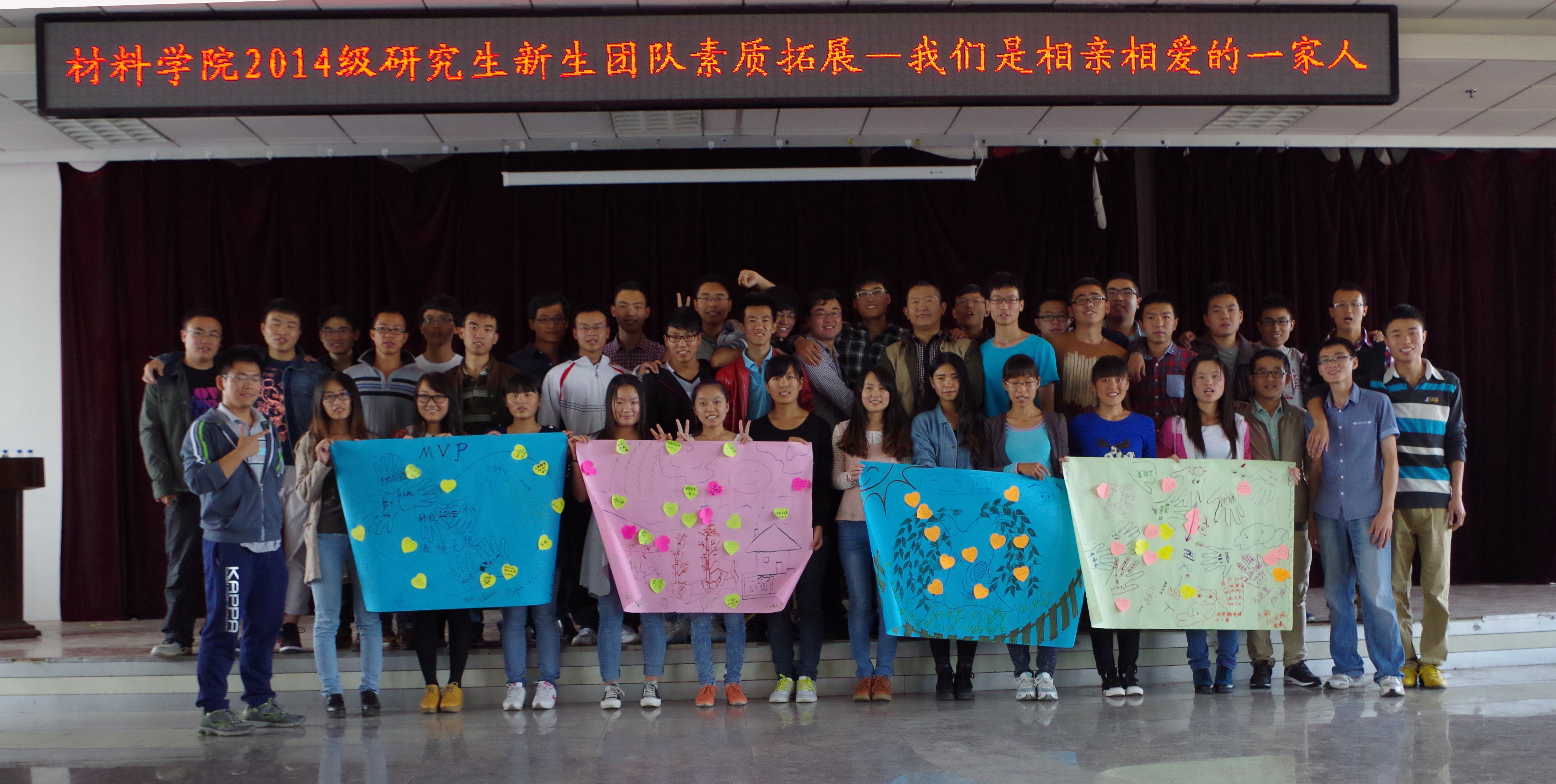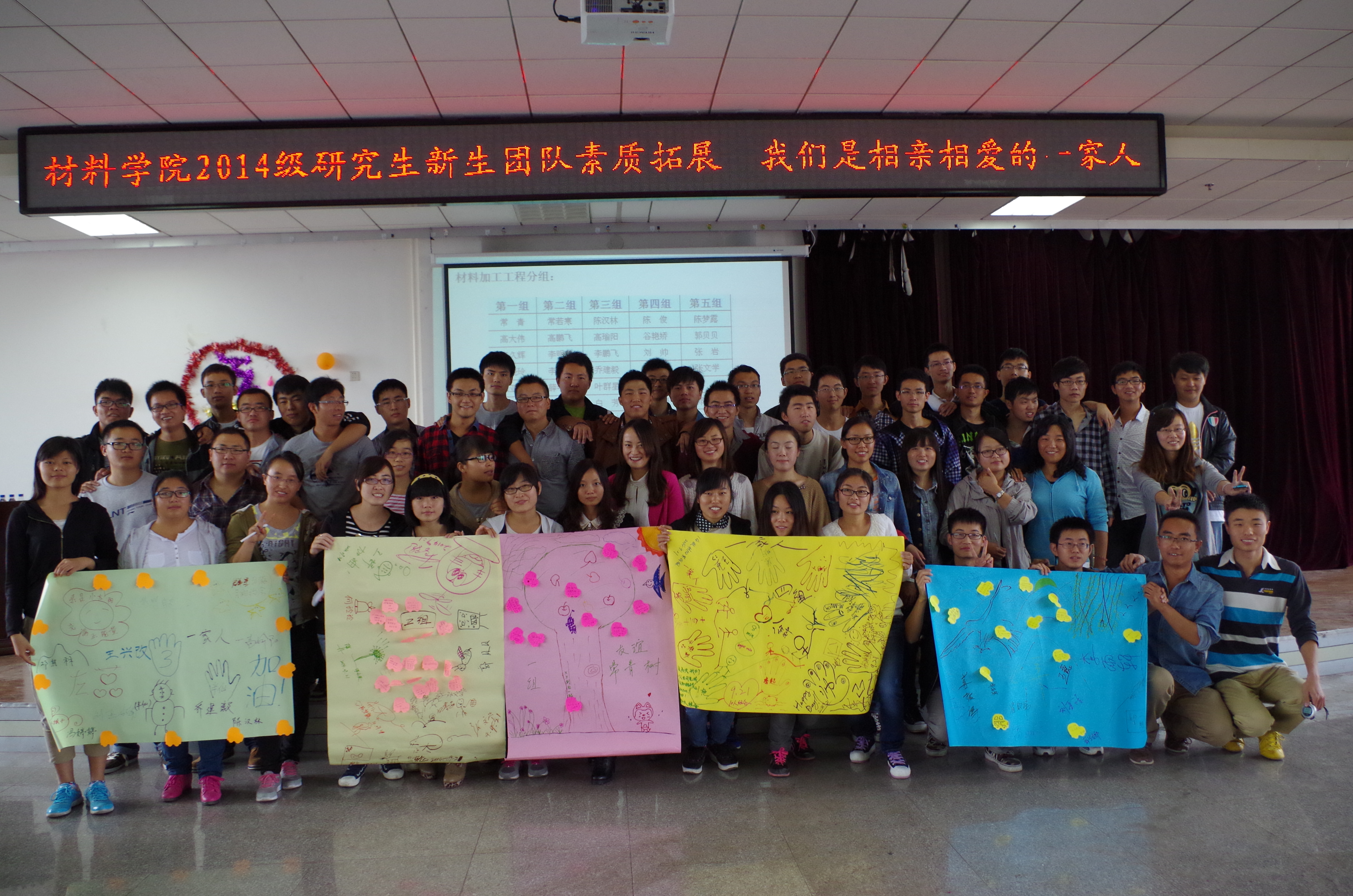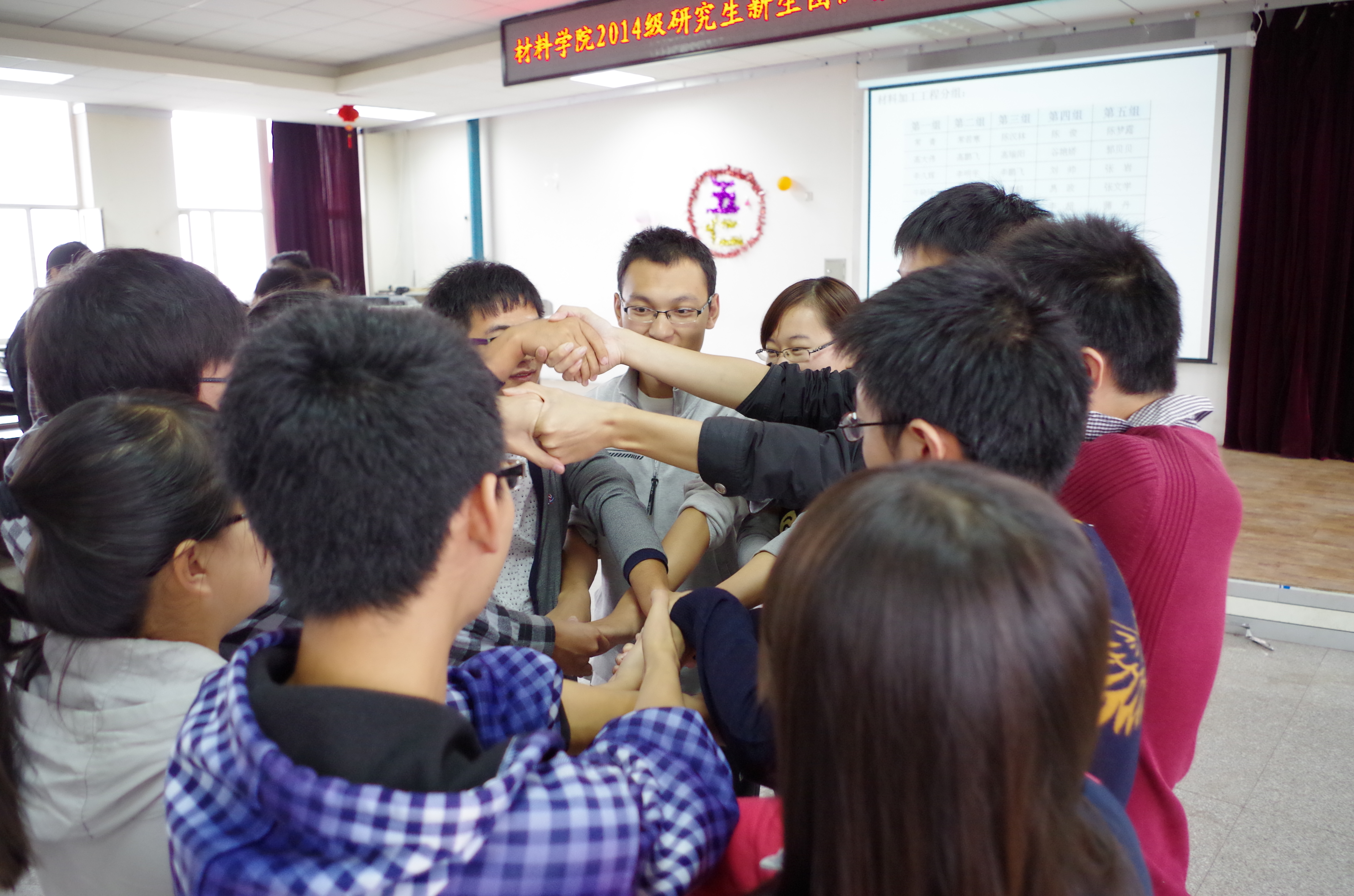 响应学校心理健康指导中心的号召,于2014年9月21日由朋辈心理辅导员和研究生新生班长组织的新生团队素质拓展——我们是相亲相爱的一家人活动,在逸夫机械材料馆8楼会议室举行。