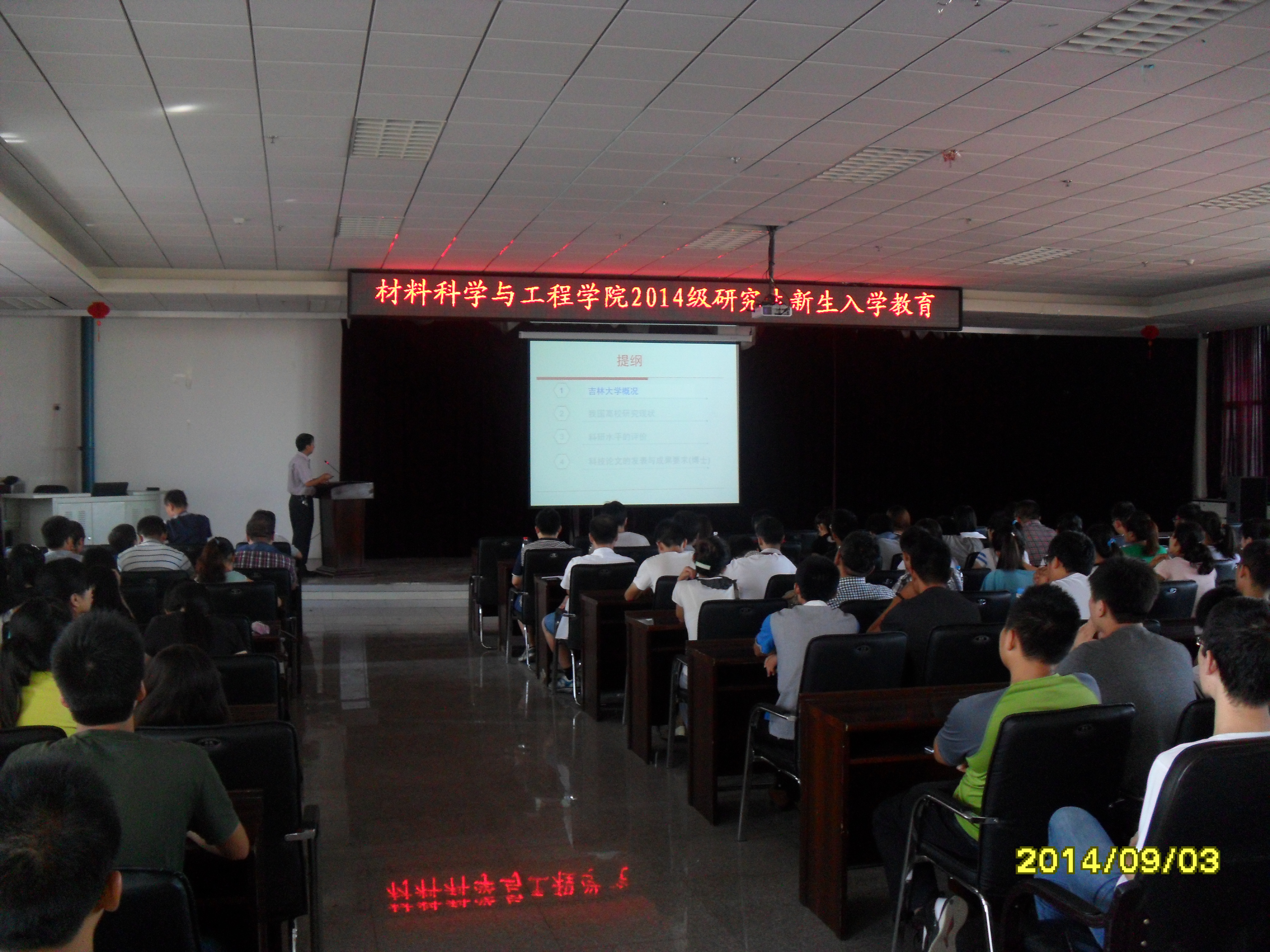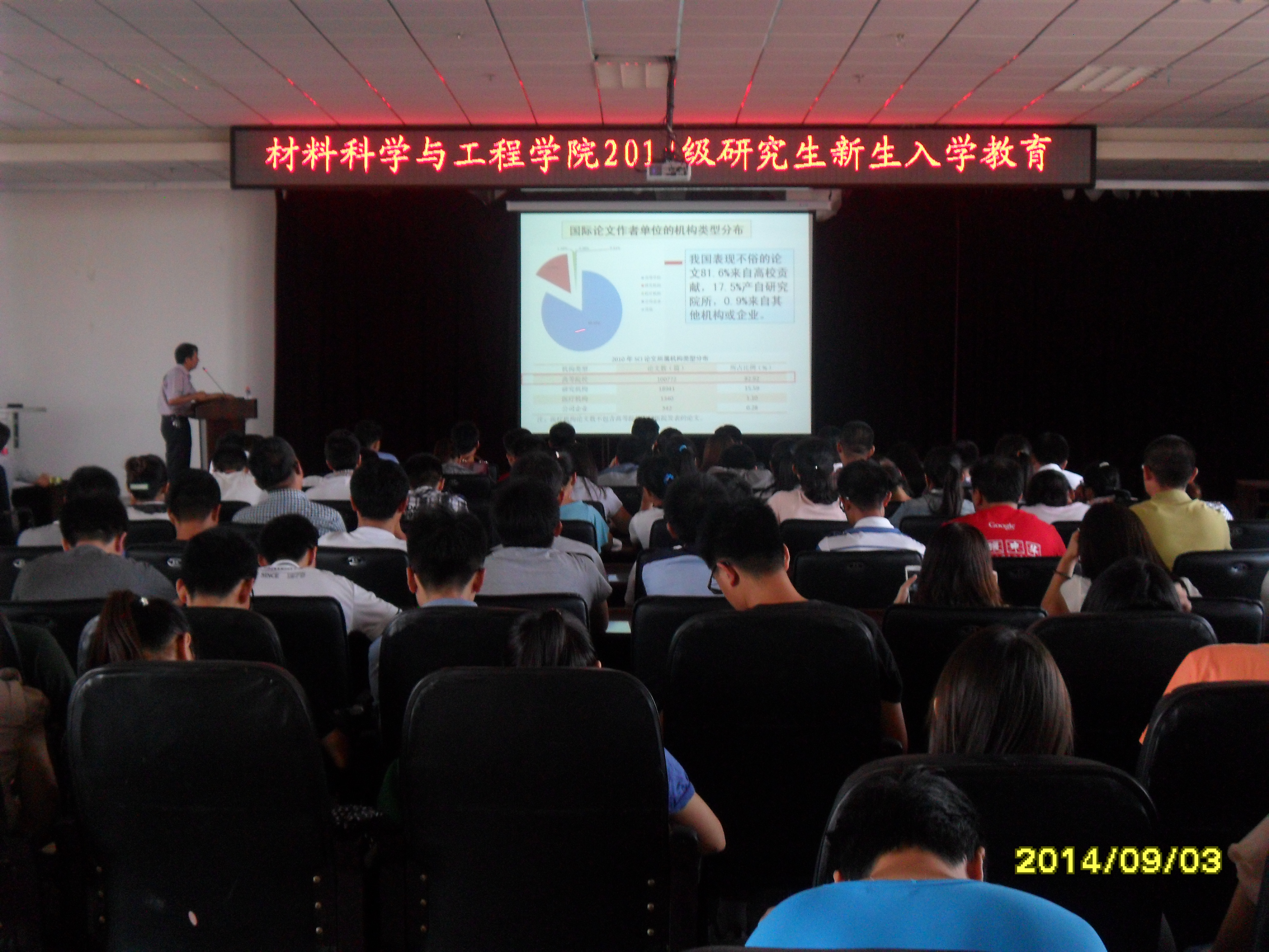 2014年9月3日上午,我院在逸夫机械材料馆报告厅举行了2014级研究生入学教育大会。副院长朱永福教授、党委副书记于雅琳老师、研究生办公室秘书刘徽老师,以及材料学院2014级全体博士、硕士研究生参加了本次会议。