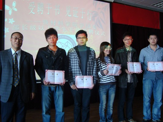 为加强学生干部的责任感和使命感,切实做好自己的工作,真正的起到模范带头作用,2009年10月12日中午,材料学院全体学团委成员以及大一的班干部齐聚南岭逸夫机械材料馆,参加了“受聘于书,见证于行”学团委部长级以上学生干部受聘仪式。党委副书记兼副院长唐立山老师,辅导员辛颖、柴媛老师参加了本次受聘仪式。