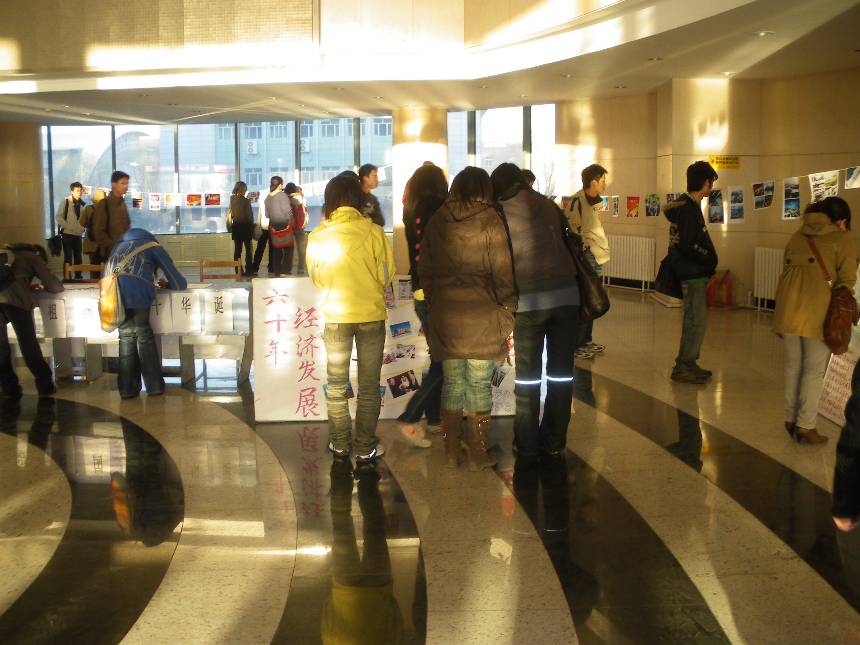 本次图片展为期三天,有近百张图片展出,从各个方面向广大师生重现了祖国六十年的辉煌历程。这些图片经过精心策划和筛选,系统全面地展现了从1949年建国初期到现今祖国在科技、军事、经济、文化、教育等多方面取得的巨大成就。内容包括了改革开放、港澳回归、北京奥运、神舟系列发射成功等重大事件。在展示的图片下方都添加文字说明,让同学们充分了解这六十年的巨大变化和人民生活水平的显著提高。现场吸引了很多同学驻足观看,一幅幅图片给大家带来了震撼的视觉效果,使同学们深受感染,纷纷在“寄语祖国六十华诞”的展板上写下自己对祖国的美好愿望。