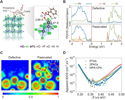 合作团队通过原子尺度的第一性原理材料模拟揭示了钙钛矿深能级缺陷的协同钝化机理:氰基的引入能够进一步加强原有膦酸基团对钙钛矿表面铅相关深能级缺陷的钝化能力,形成一种“螯合”的协同钝化晶体构型(图2A)。电子局域函数的分布图表明了氰基与膦酸基团与缺陷铅原子明显的成键行为(图2C),这种对缺陷铅原子周围八面体配位环境的补齐是双亲性分子显示出优秀缺陷钝化能力的主要原因。投影态密度的计算结果显示深缺陷能级通过与双亲性分子的成键钝化作用移动到了导带与价带内部(图2B)。