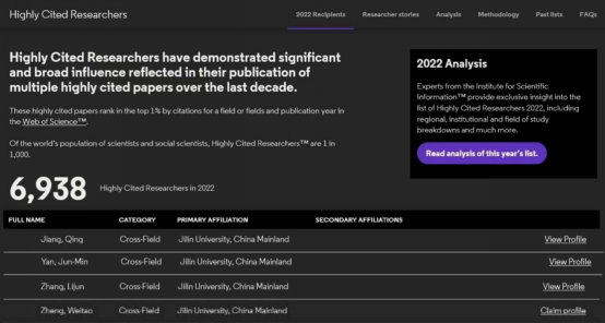 全球高被引科学家由科睿唯安旗下科学信息研究所遴选,该榜单是遴选全球高校、研究机构和商业组织中对所在研究领域具有重大和广泛影响的顶尖科学人才,数据是根据2011年1月至2021年12月的11年期间所发表的高被引论文数量遴选得出。遴选方法是基于科睿唯安科学信息研究所文献计量专家所进行的数据分析,利用 InCites™ 和 ESI™,按照基于学术论文发表数量和Web of Science™引文数据的科研绩效指标和趋势数据专门制定。入榜的自然科学家和社会科学家均发表了多篇高被引论文,其被引频次位于同学科前1%。入选这份榜单,意味着该学者在过去十年对自然科学和社会科学的单个或多个学科产生了重要的学术影响力。