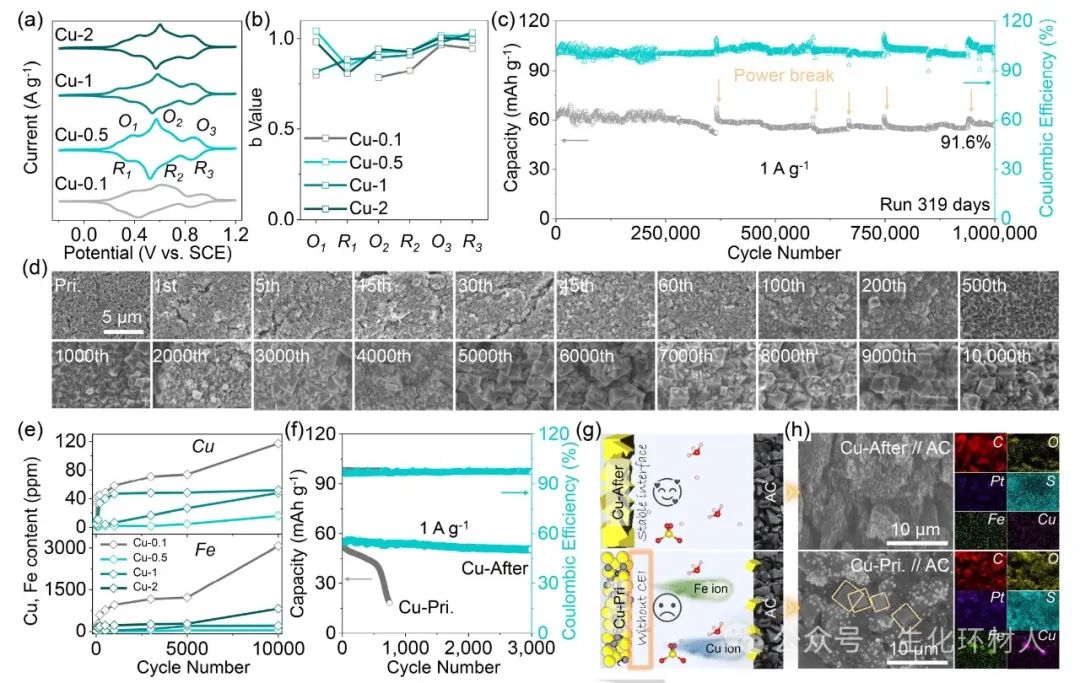 图2. CuHCF的电化学性能。(a)扫描速率为5 mV/s的循环伏安(CV)曲线;(b)b值;(c)长期稳定性;(d)不同循环次数下Cu-0.5的SEM图像;(e)不同循环期间电解液中Cu和Fe含量的ICP测试;(f)全电池的稳定性;(g)全电池的示意图;(h)稳定性测试后活性炭(AC)的SEM图像和EDS元素映射。