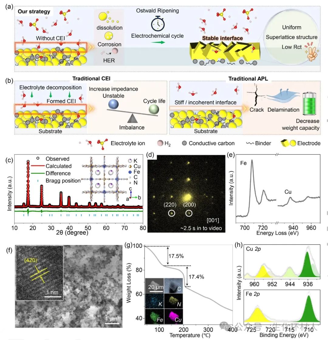 图1. CuHCF的结构表征。(a)奥斯特瓦尔德熟化(OR)过程的示意图;(b)传统电解质界面层(CEI)和人工保护层(APL)的示意图;(c)XRD图谱的Rietveld分析(插图为晶体结构);(d)选区电子衍射(SAED);(e)电子能量损失光谱(EELS);(f)扫描电子显微镜(SEM)图像(插图为高分辨透射电子显微镜HRTEM图像);(g)热重分析(TGA)(插图为EDS元素映射);(h)Cu 2p和Fe 2p的X射线光电子能谱(XPS)
