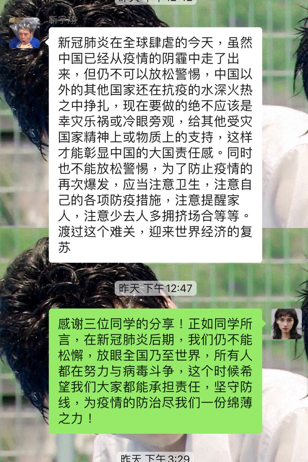 本次线上班会伊始由同学们分享了疫情爆发以来感动国人的重大事件,身边发生的令人感动的抗疫故事,然后就国际疫情形势与相关新闻,社会上出现的抗疫语录做了分享。随后班委再次提醒了同学们抗疫后期所要注意的事项。接近活班会尾声,班委同学围绕抗疫精神作了总结,让同学们再一次感受到了这份精神的磅礴力量。