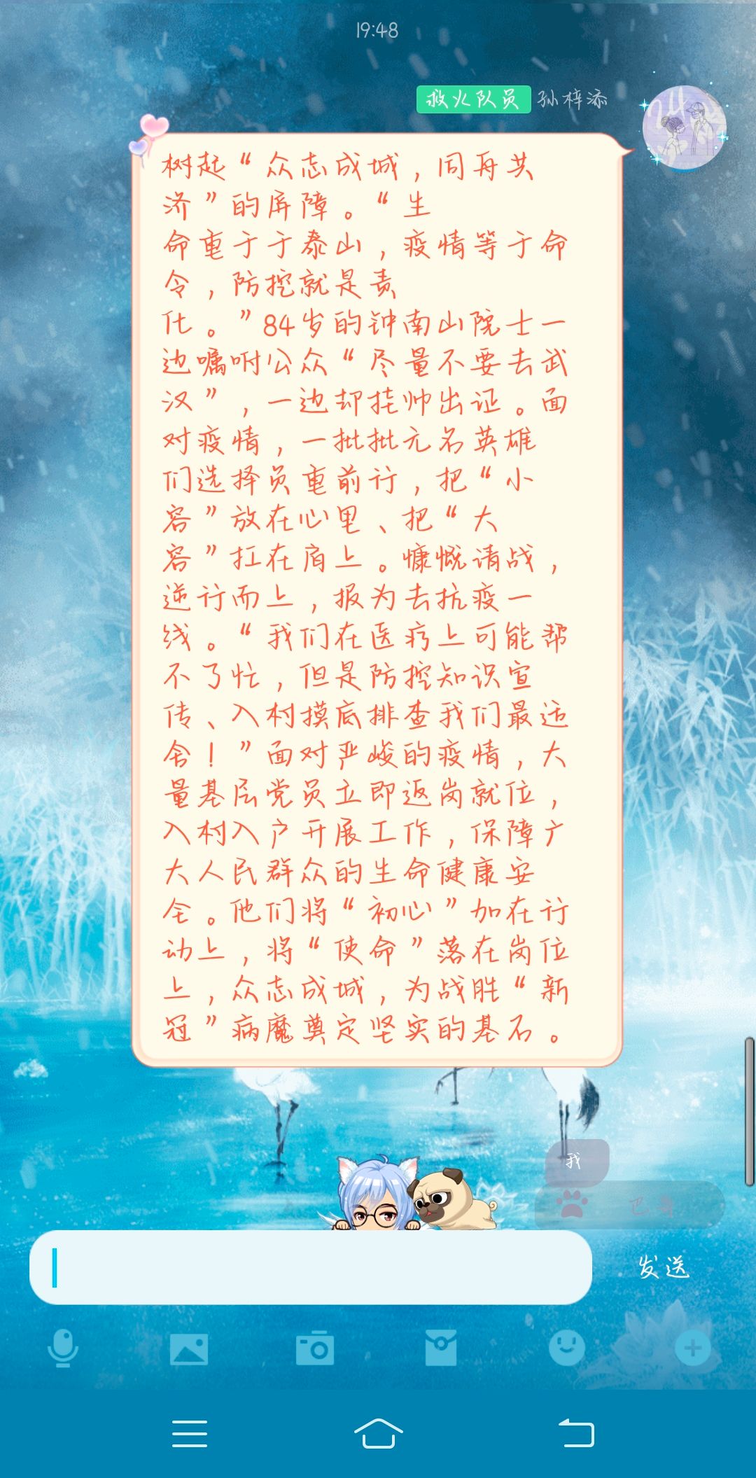 本次主题线上班会,旨在通过对抗疫英雄的故事与抗疫语录的分享,让全体团员更加深刻的了解抗疫精神,感受到身边人的温暖,多元化理解爱国精神,提升社会责任感与制度信念感,是一次意义重大的团课。带着这份抗疫精神与制度自信,未来,同学们也必将以更加饱满的热情投身到我们的伟大祖国的建设当中!