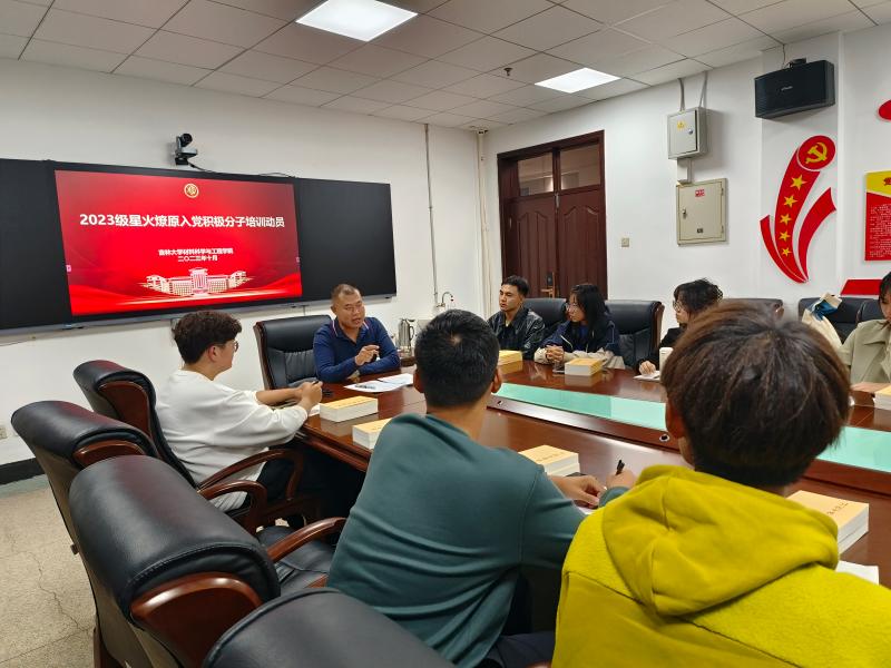 于2023年10月16日在南岭校区逸夫机械材料馆410会议室召开2023级本科生“星火燎原”培养项目(第五期)学员培训动员暨第一次集体学习。学院全体2023级本科生“星火燎原”培养项目(第五期)学员参加了本次活动,学院本科生党支部书记、2021级、2023级材料类专业辅导员严冬老师参加活动,并进行动员交流。