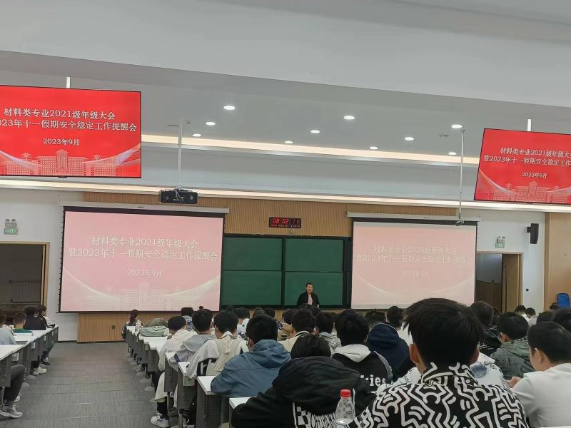 于2023年9月28日上午在南岭校区逸夫楼B110开展了材料类2021级年级大会暨2023年十一假期安全稳定工作提醒会,本次会议由学院2021级、2023级材料类专业辅导员严冬老师主持,学院材料类2021级全体同学参加了本次会议。