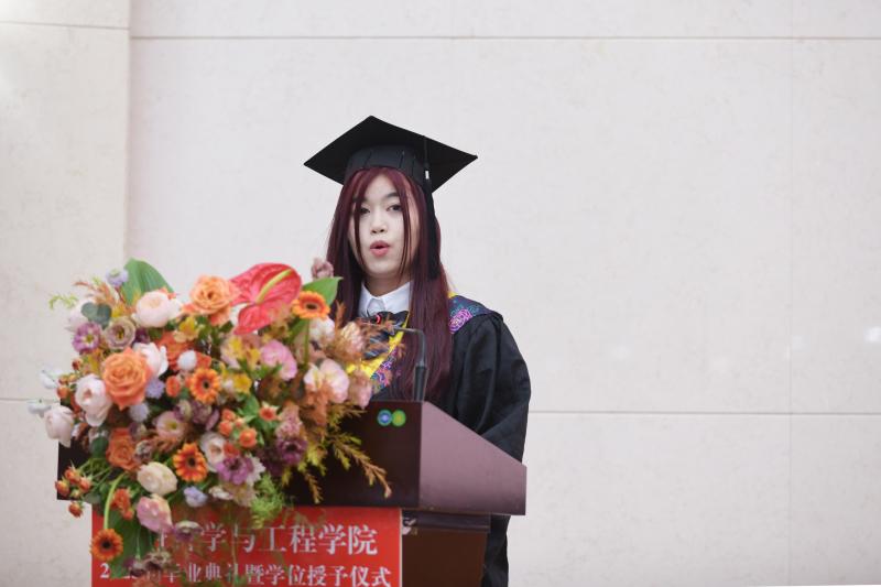 在校学生代表2020级本科生王亚婕同学表达了对学长学姐的祝贺和祝福,各位在校生将以学长学姐为榜样,继续走好未来的每一步,努力成为学校和学院的骄傲。