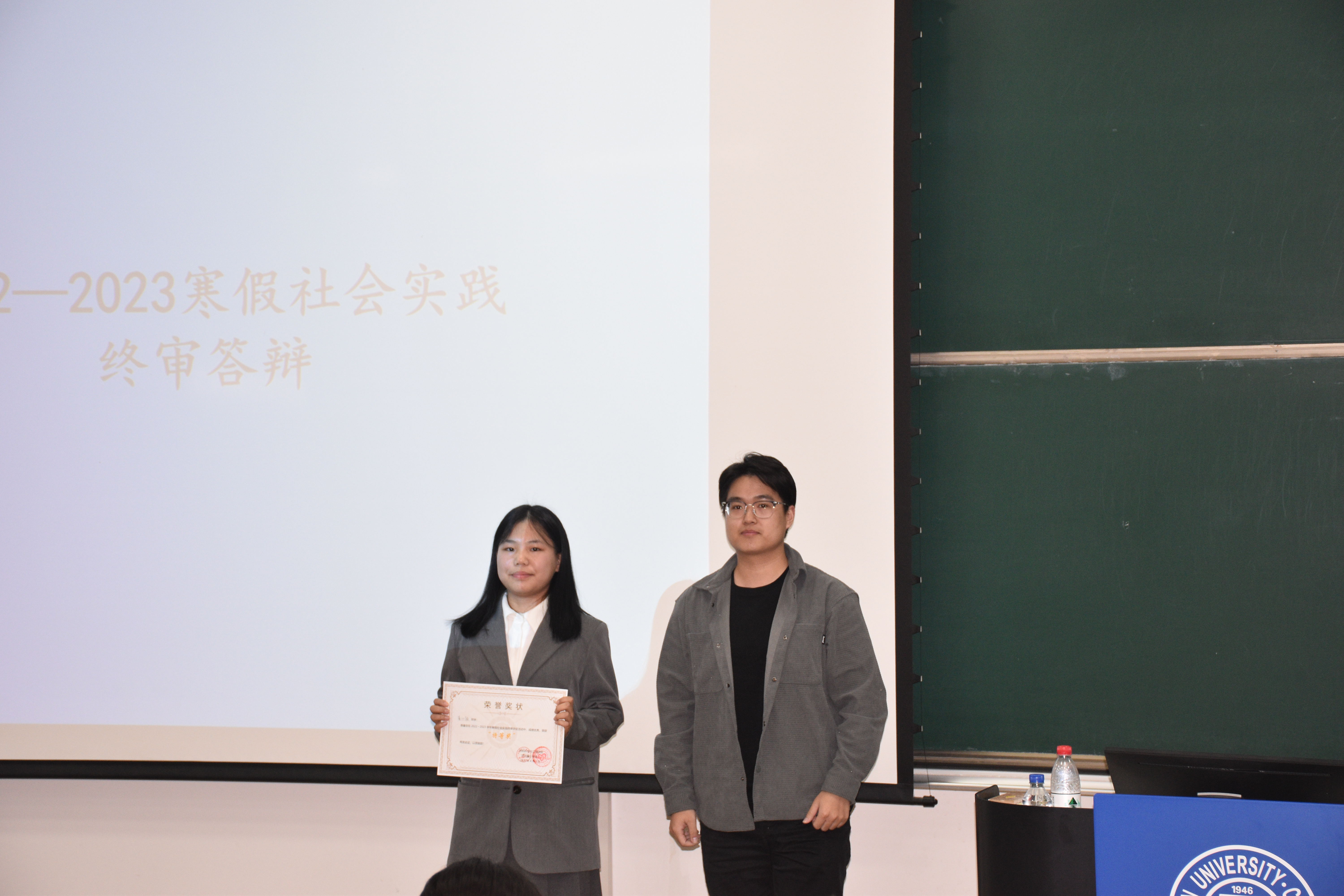 在说明答辩规则并示范后,主持人宣布答辩会议正式开始。在社会实践初审中脱颖而出的十位同学,依次通过幻灯片展示和精彩的演讲,汇报了寒假实践活动的历程与感悟。他们的实践主题包含“千人千团进校园”“乡村振兴实地调研”等,实践内容丰富,社会意义深远,在呈现红色文化的同时,传递社会实践的核心价值,薪火相传生生不息。各位评委根据评分细则为每位选手的答辩进行评分,并由工作人员进行汇总分数与排名。在接下来的颁奖典礼上,各位评委为获奖同学颁发荣誉证书。通过这次活动,同学们更加体会到了本次寒假社会实践活动的意义。此次寒假社会实践终审答辩会在同学们的掌声中完美落幕。