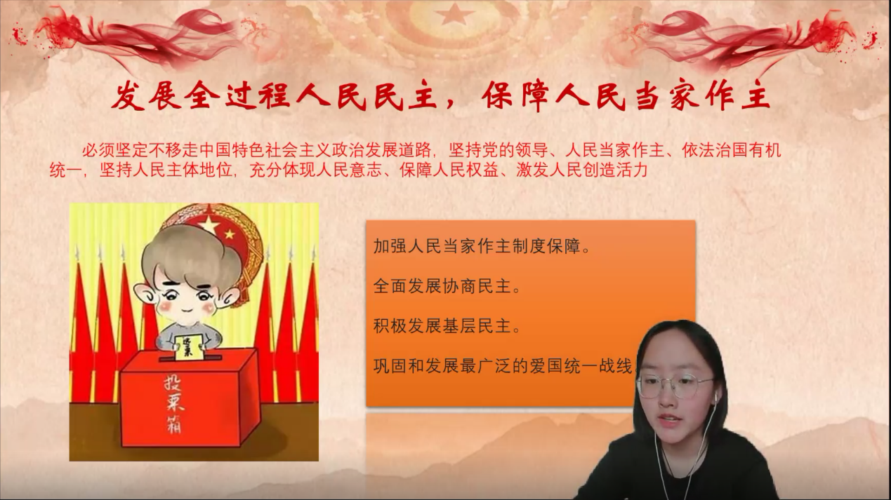 由周小涵、倪福蓬、李万蓉、王薇然、刘双乐同学组成的小组在深入学习了习近平总书记在党的二十大代表大会上作出的发言后,精心制作出了一堂能够将二十大精神全面展现给大家的团课,他们最终以线上的形式完成了此次活动。