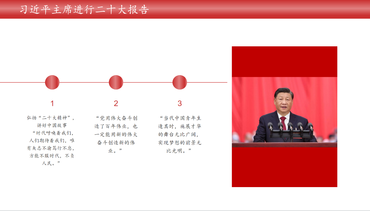 王薇然和倪福蓬同学负责将讲稿和PPT结合起来,分为五个板块。在每个板块中都与二十大紧密结合,采用图片和文字相结合的方式让整个内容更加丰富,更加生动。