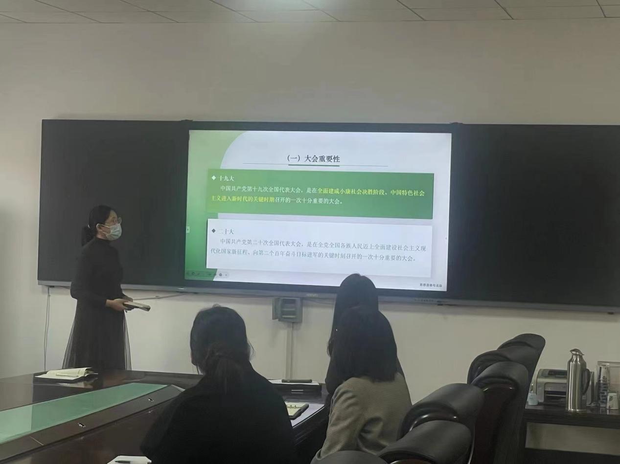 会议由王晗老师主持。首先,全体参会成员共同观看了二十大报告解读的视频,回顾了新时代十年的非凡成就与伟大变革。2022级七班班主任张霏霏老师和李莉莉老师相继为同学们分享了她们自己学习二十大的心得体会。与会老师针对同学们提出的问题与困惑给予了解答,勉励同学们要在学业发展、学团活动、科研实践等活动中不断明晰自己的方向。最后由华蕊老师总结发言,引导新时代大学生培养能吃苦的品格,激励同学们努力学习、积极进取,发挥自己的个人优势和特点,借助学校和学院的良好平台,实现自己的梦想和追求。随后,全体与会师生在材料馆410合影留念。
