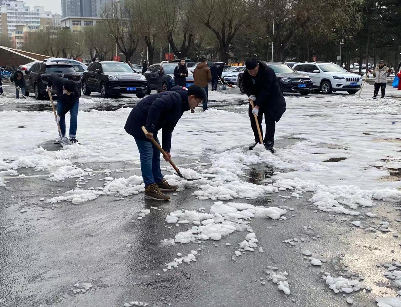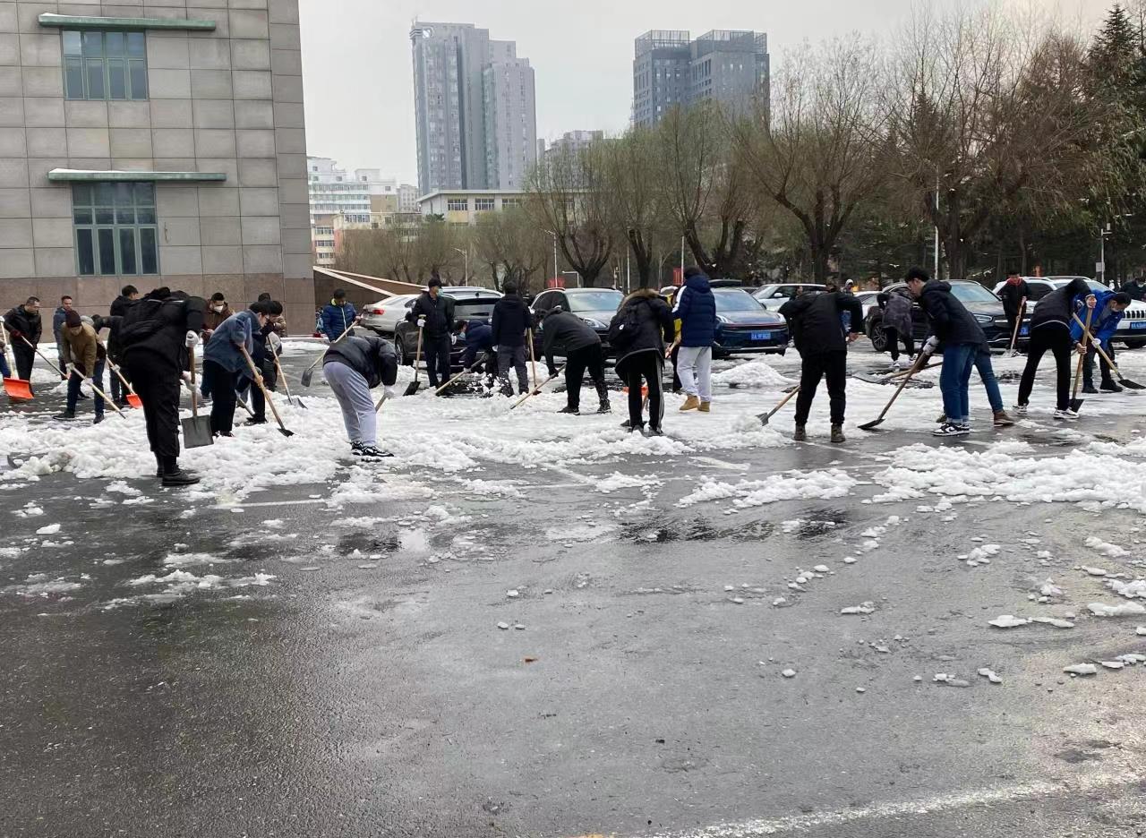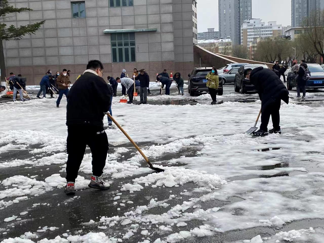 活动期间,同学们拿着铁锹、雪铲等清理工具开始清雪除冰工作,虽然积雪融化导致道路湿滑,但是同学们不畏寒冷、分工合作,用铲子一次次地铲入冰层缝隙处,以最快的速度将积雪推至道路两侧,为师生们开辟了一条安全畅通的方便之路。热火朝天的劳动场面,让严寒的天气显得暖意浓浓,忙碌的身影构成一道亮丽的风景线。