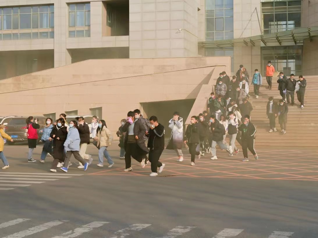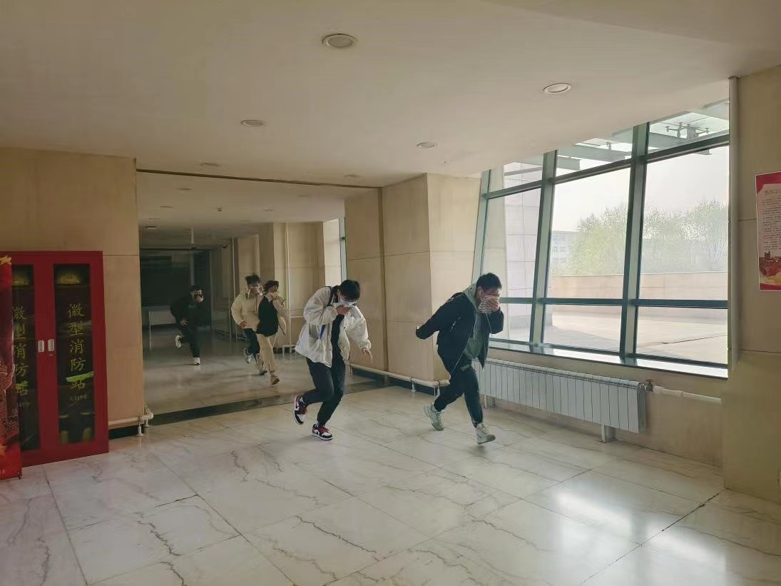 随着警报声响起,全体学生在各位疏散老师的引导下,用毛巾捂住口鼻,按照既定的逃生路线撤离到室外安全地点,整个过程快速高效。