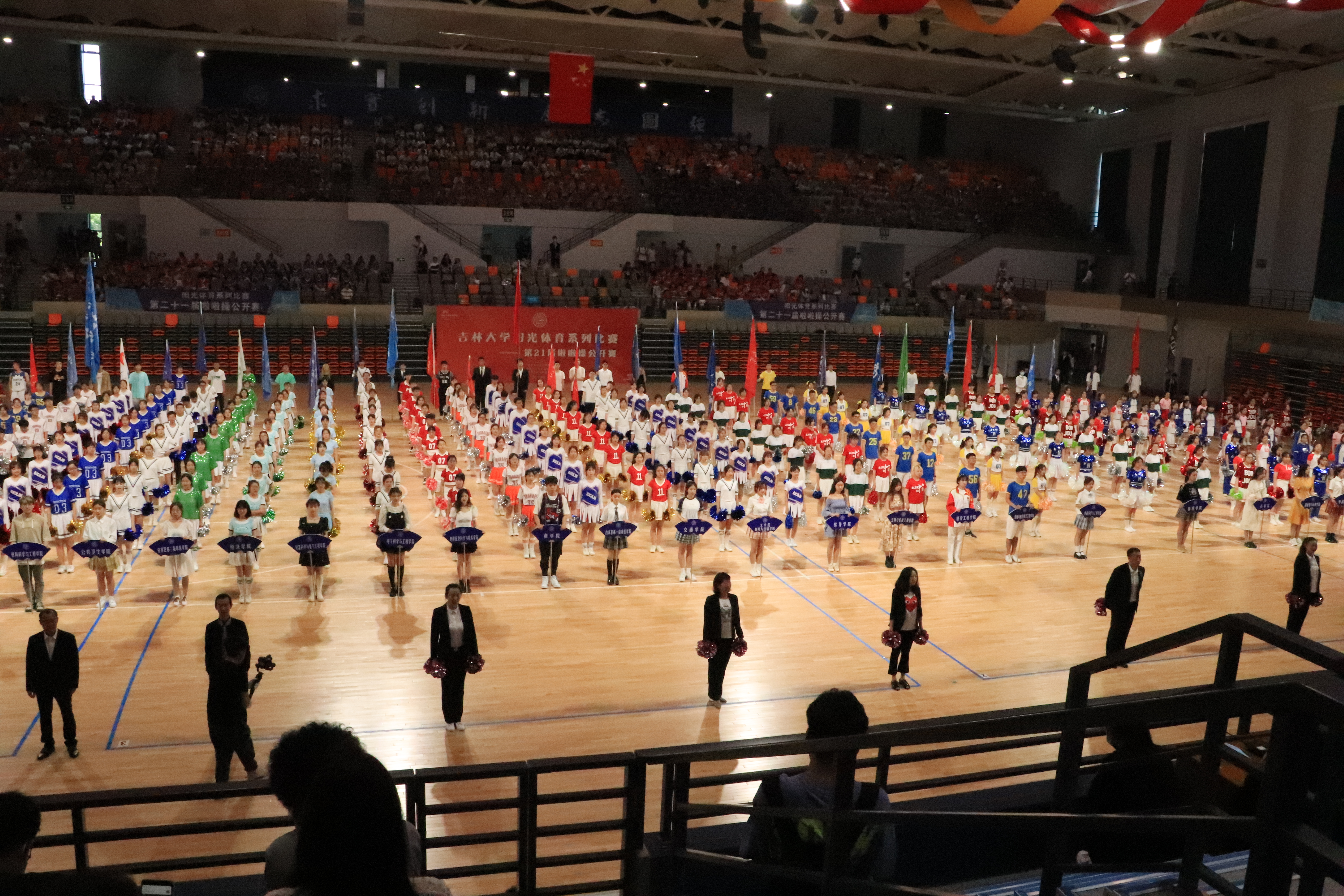 13:00,公开赛开幕式开始,各个学院的院旗、院牌手和十名方阵代表在体育馆篮球场集合,在主持人和裁判队的带领下现场学习动作,跟随音乐舞蹈,将全场的气氛炒热。随后,比赛正式开始,各学院的啦啦操方队按照原先排好的场次就位,在主持人指示下轮流入场,跟随音乐《少年》翩然起舞,展示他们一个月来辛勤练习的成果。在音乐的结尾,各个学院的方队分别展示出自行设计的动作,并喊出自己的口号,展现着各个学院独有的风采。14:50,各方队全部表演完毕,各学院的院旗、院牌手再次回到比赛场地参加闭幕式,裁判、评委进行点评后,尹君老师安排了比赛后的啦啦操彩排任务。最后,在大家的掌声中,阳光体育啦啦操公开赛闭幕式圆满完成,啦啦操公开赛顺利结束。