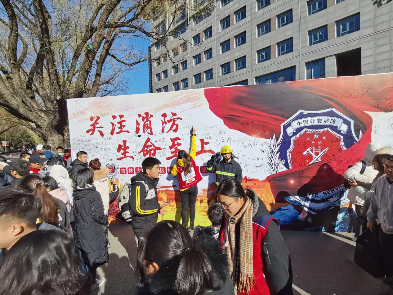 的80名同学以及其他学院的同学组织的志愿者队伍向同学们发放传单,引导学习消防和国家安全等知识,参观消防服装以及各种常见违章电器,广场各个展板前人群络绎不绝,活动达到高潮。大约一个小时后,随着展板上签满师生姓名本次消防疏散演练及安全宣传活动圆满结束。