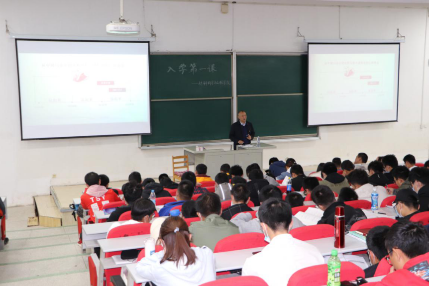 学科专业历史,细致的介绍了材料学院学科发展优势、专业情况及本科生教学工作,并向同学们展示了我院优秀的师资队伍、雄厚的科研实力和良好的就业前景,帮助新生清晰的了解所学专业的基本情况和未来行业发展态势,引导新生正确规划未来,明确学习目标。同时王文权教授并且针对不同年级不同专业的学习开展提出了建议,敦促同学们严于律己、勤奋学习,养成优良的生活学习习惯,尽快调整学习状态以适应到来的大学生活,引导学生在大学生活中全面发展,不断完善自己,成为报效国家的栋梁之才。