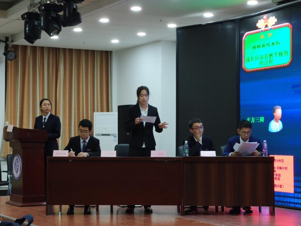 本场比赛的辩题为“成长应不应该是磨平棱角的过程”。正方以“成长应该是磨平棱角的过程”为基础,层层递进论述观点。随后,反方就“成长不应该是磨平棱角的过程”这一观点从“事理”和“人情”两个方面破题立论。双方辩手沉着冷静,有条不紊地应对对方提出的问题。在激烈的自由辩论环节中,双方辩手逻辑思维环环相扣,在不断的进攻和防守中迸发出思想碰撞的火花。比赛接近尾声,双方辩手以清晰的思路总结陈词,再次对己方论点进行升华。现场掌声不断。最后,评委们在经过慎重的讨论后,对本次比赛进行了认真全面的点评,并由主席宣布总决赛冠军为反方材料物理辩论队。比赛结束后,2019级辅导员刘艳丰为本场比赛获胜方、本场最佳辩手正方四辩以及历场最佳辩手颁发荣誉证书。在进行合影留念后,本次比赛圆满结束。