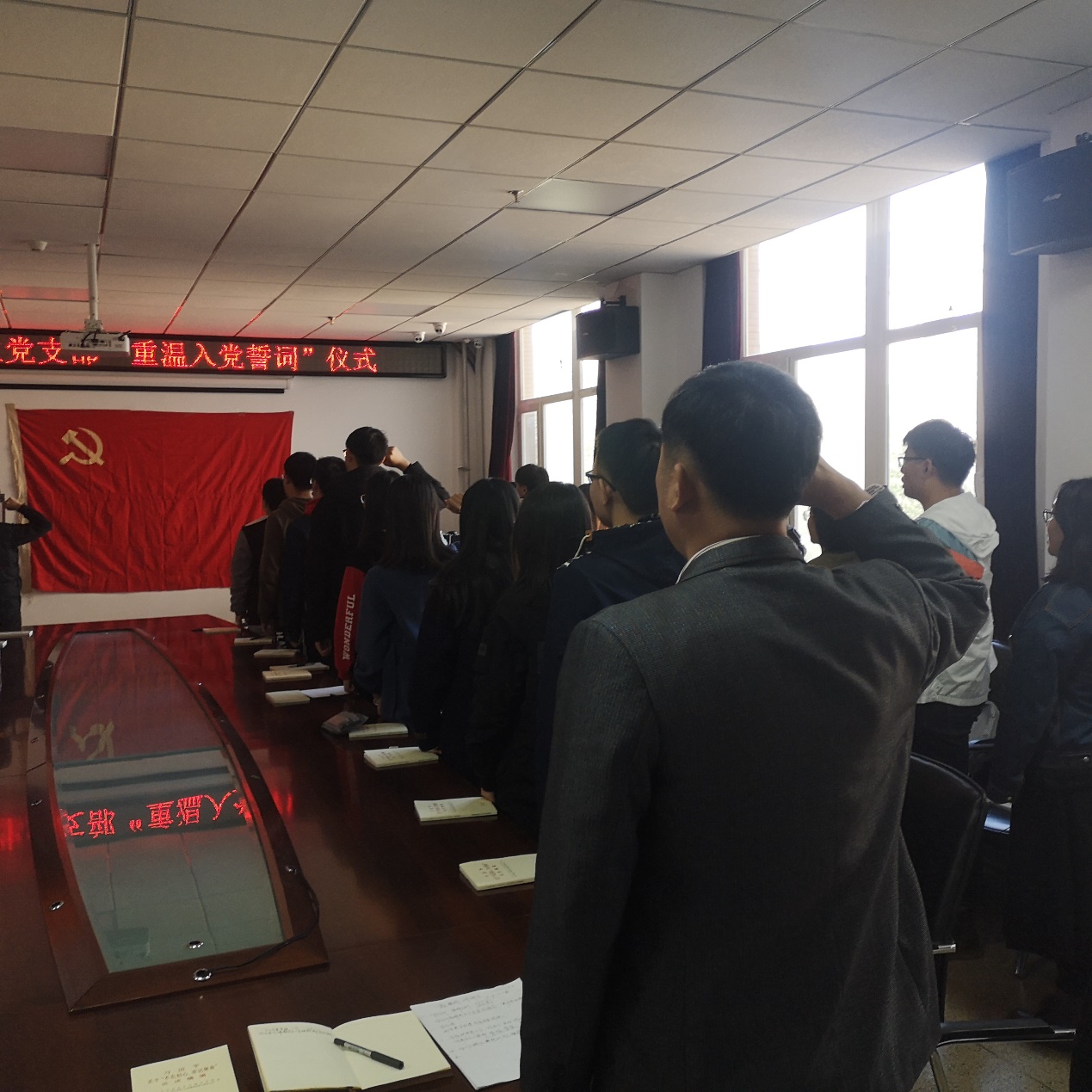 党委副书记兼副院长李东生老师的带领下,面对神圣的党旗,举起右拳,重温入党时的信念与理想,再次发出铮铮誓言。“我志愿加入中国共产党......随时准备为党和人民牺牲一切,永不叛党。”铿锵有力的誓言宣示着党员们坚定不移的政治信念,饱满激昂的斗志表达出为党的事业奋斗毕生的坚强决心。入党誓词是座右铭,是共产党员的行动指南,通过重温入党誓词,色图