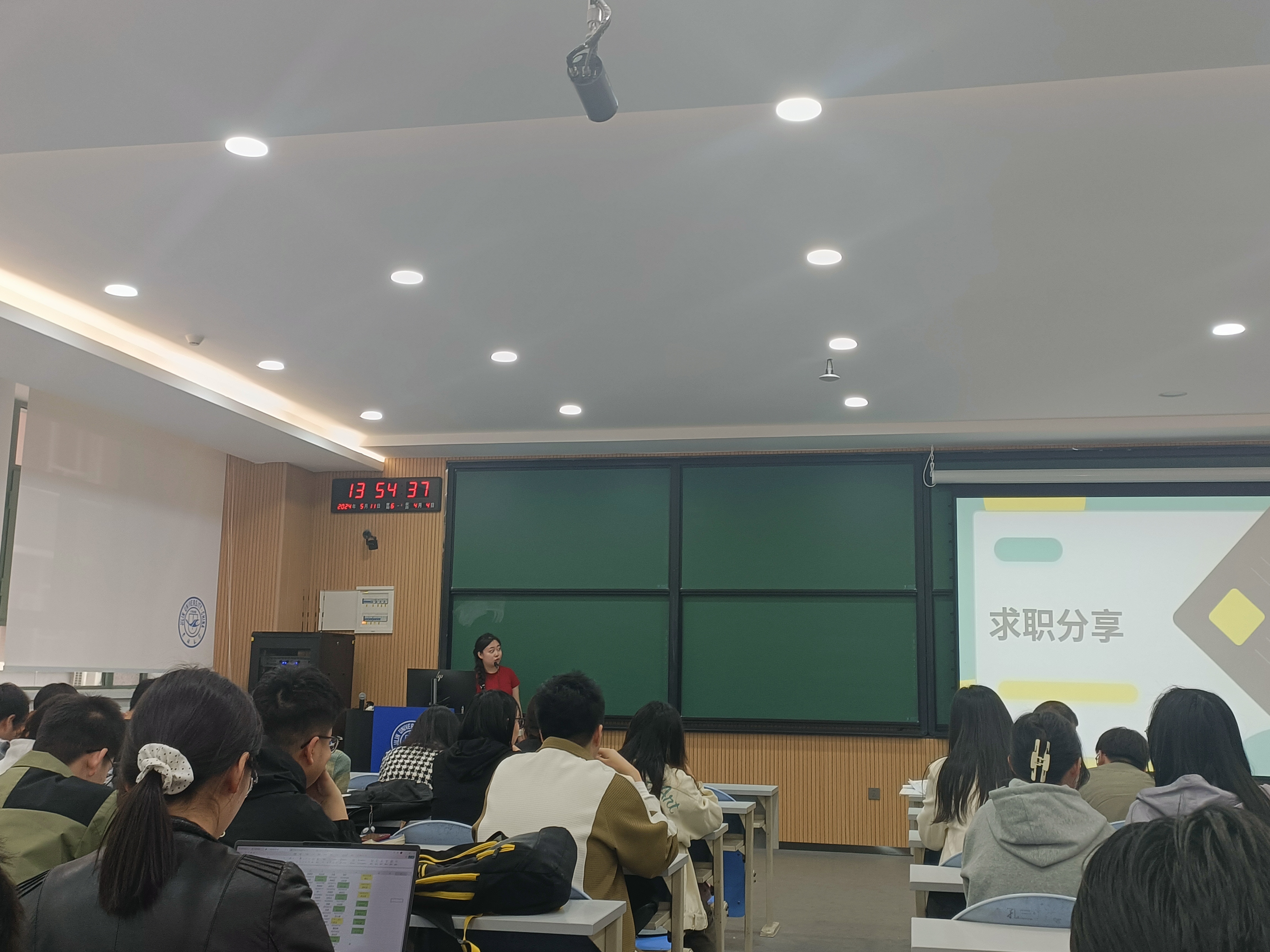 首先,由已经签约一汽集团的王圣智学长与应佳轩学姐分享自己在找工作过程中遇到的问题,以及应对各种问题的方法。随后,由考上公务员的艾森学姐介绍自己在找工作过程中的不断尝试过程,以及自己对于未来的明确分析。最后,严老师指出,不论选择考研或是工作,都要在充分分析了解自己目标的基础上去进行,并提醒同学们要提前规划自己的未来方向,做好准备。