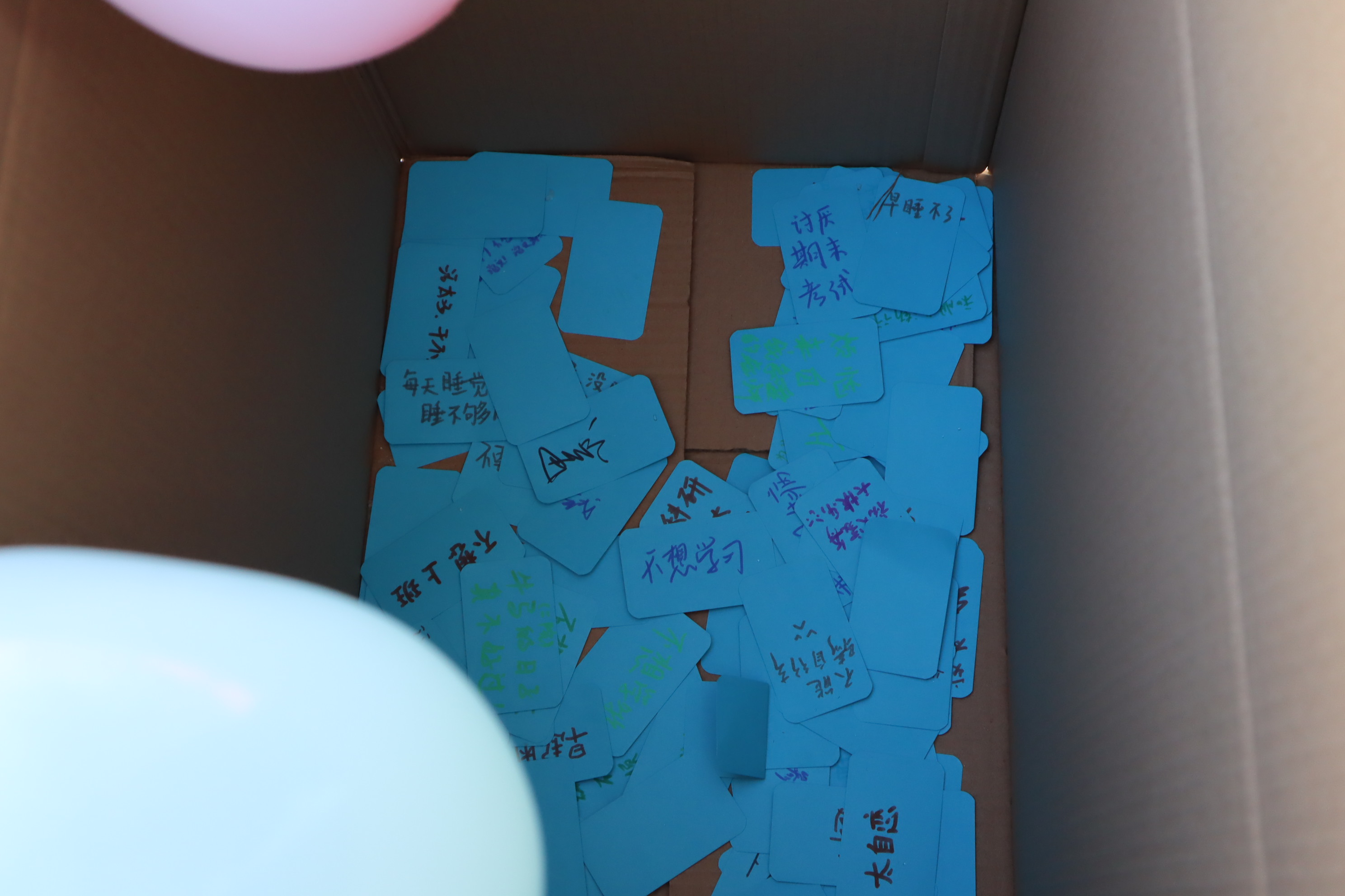 活动伊始,同学们前往“情绪交换商店”,将自己的烦恼在情绪卡片上写下后投入“情绪垃圾桶”中,和烦恼告别。随后,同学们有序抽取了“情绪交换商店”提供的专属祝福语,并在“快乐共享盲盒”中随机抽取了心理健康教育宣传礼物,收获一天的好运与快乐。在一片欢声笑语中“情绪交换商店”心理互助交流活动圆满落幕。