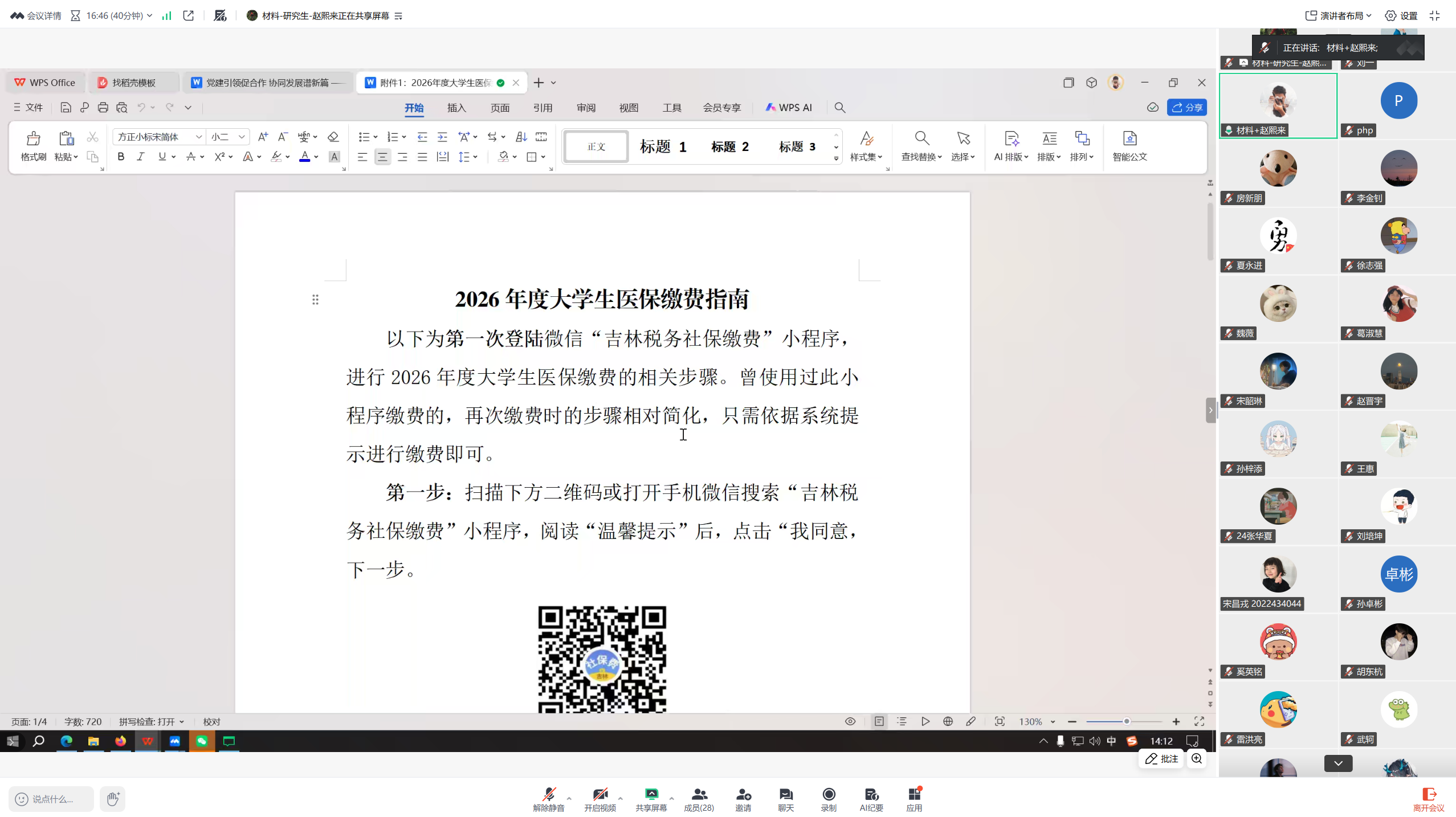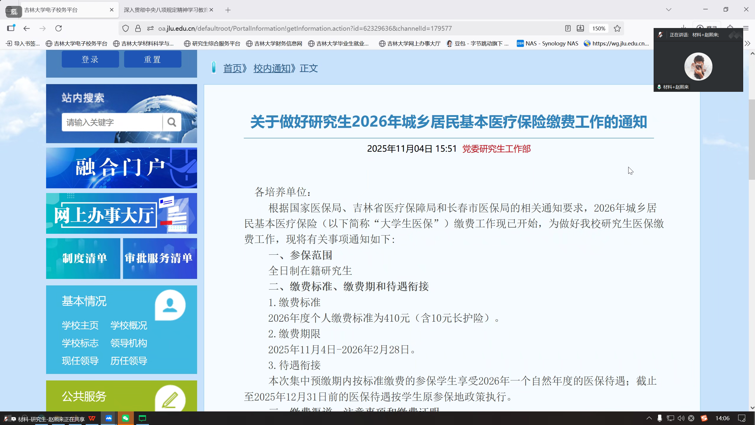 于2025年11月5日线上召开了2026年研究生医保缴纳政策解读会议。会议由辅导员赵熙来主持,学院全体研究生班级干部参加。