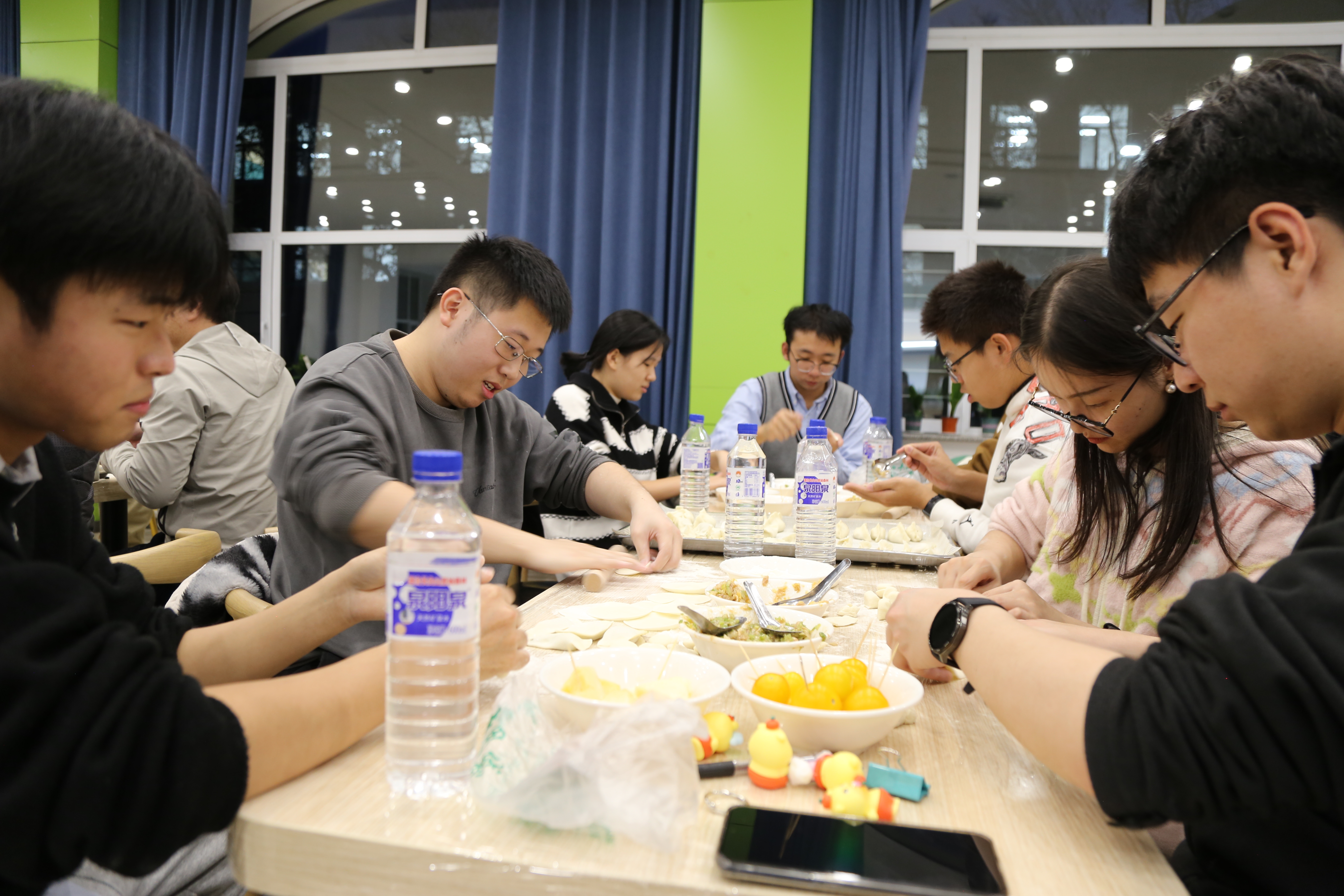在包饺子环节中,同学们分工协作,揉面、擀皮、包馅、摆盘,形成了一条高效的“合作链”。具备经验的同学主动担任“技术指导”,耐心示范;初次尝试的同学积极学习,从生疏到熟练,在劳动中体验到成就感和团队归属感。材料学院徐虹老师也亲临现场,与同学们亲切交流,给予鼓励和指导,进一步增强了活动的教育意义和心理支持作用。