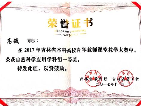 3. 吉林省本科高校青年教师课堂教学大赛,自然科学应用学科组一等奖,获奖人:高钱,吉林省教育厅、吉林省总工会,2017.11.01