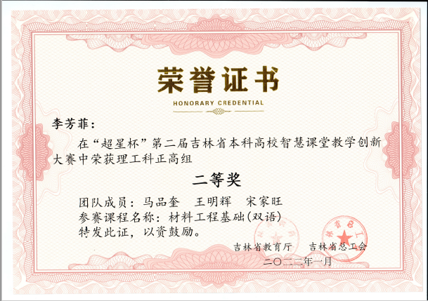 4. 吉林省本科高校智慧课堂教学创新大赛,理工科正高组二等奖,获奖人:李芳菲、马品奎、王明辉、宋家旺,吉林省教育厅、吉林省总工会,2022.01