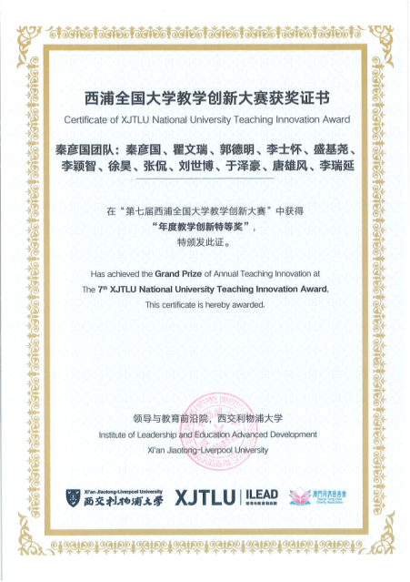 1. 第七届西浦全国大学教学创新大赛年度教学创新大赛,西交利物浦大学领导与教育前沿研究院,年度教学创新特等奖,2022.07.01